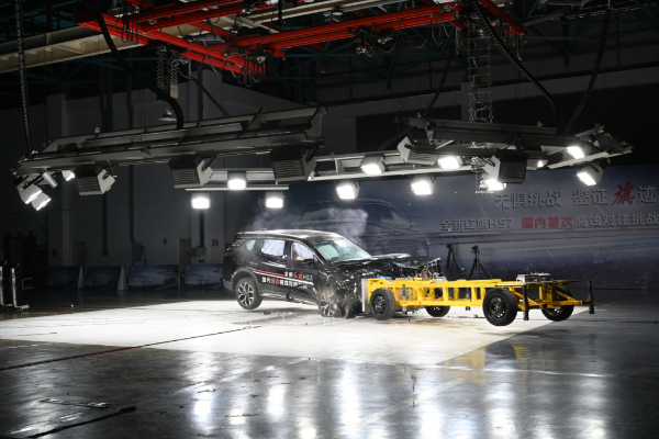 本次碰撞試驗,在中國汽車技術(shù)研究中心實車碰撞實驗室進(jìn)行。經(jīng)過鹽水噴淋試驗后的全新紅旗HS7與試驗臺車,以100km/h的相對速度,進(jìn)行車輛正面副駕駛側(cè)50%對碰。