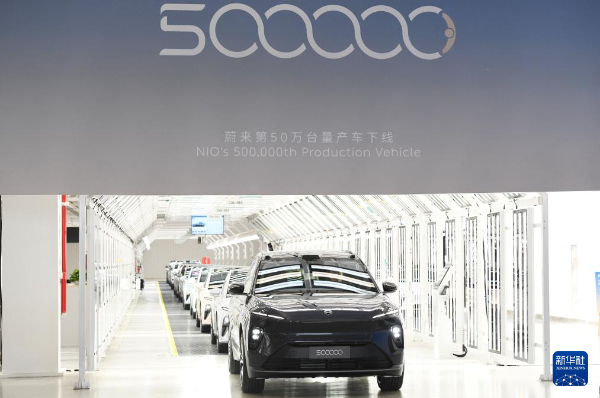 5月9日,在安徽省合肥市新橋智能電動汽車產(chǎn)業(yè)園蔚來第二工廠,蔚來第50萬臺量產(chǎn)車下線。新華社記者張端攝