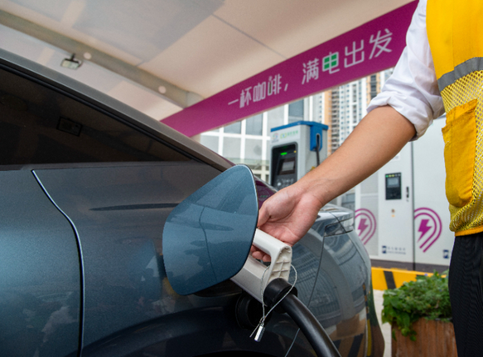 (資料圖片)工作人員為一輛新能源汽車插槍充電。新華社記者 徐嘉懿 攝