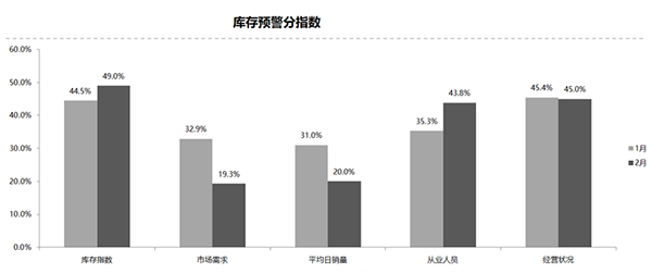 從庫存預(yù)警分指數(shù)來看,庫存指數(shù)、從業(yè)人員指數(shù)環(huán)比上升;市場(chǎng)銷量指數(shù)、平均日銷量指數(shù)、經(jīng)營(yíng)狀況指數(shù)環(huán)比下降。樊宇表示,2月庫存預(yù)警指數(shù)較高,依然位于50%的警戒線之上。同時(shí),因?yàn)槭袌?chǎng)需求和平均日銷量呈明顯下降狀態(tài),經(jīng)銷商面臨較大壓力。