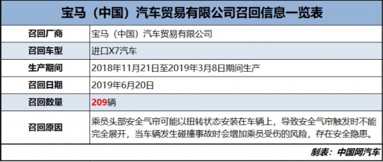 6月20日下午,國家市場監(jiān)督管理總局發(fā)布消息,寶馬(中國)汽車貿(mào)易有限公司根據(jù)《缺陷汽車產(chǎn)品召回管理條例》和《缺陷汽車產(chǎn)品召回管理條例實施辦法》的要求,決定自即日起,召回2018年11月21日至2019年3月8日期間生產(chǎn)的部分進口X7汽車,共計209輛。