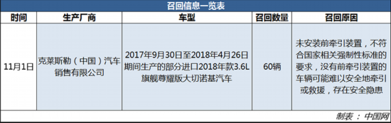 中國網(wǎng)汽車11月4日訊 近日,克萊斯勒(中國)汽車銷售有限公司根據(jù)《缺陷汽車產(chǎn)品召回管理條例》和《缺陷汽車產(chǎn)品召回管理條例實(shí)施辦法》的要求,向國家市場監(jiān)督管理總局備案了召回計劃。決定自11月1日起,召回2017年9月30日至2018年4月26日期間生產(chǎn)的部分進(jìn)口2018年款3.6L旗艦尊耀版大切諾基汽車,共計60輛。