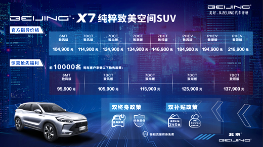 另外,北京汽車表示,前1萬名購車用戶還可享受燃油版車型9.59-13.79萬元限時優(yōu)惠,以及終身保養(yǎng)、終身質(zhì)保、終身基礎流量免費等優(yōu)惠政策。