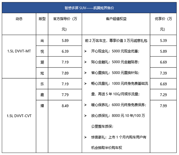 6月22日,凱翼炫界迎來上市。新車提供1.5L DVVT-MT、1.5L DVVT-CVT兩種動力組合,共計(jì)7款車型,售價(jià)為5.39萬元——7.99萬元。