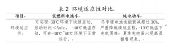 氫燃料電池車與純電動車的環(huán)境適應性對比如表2所示。