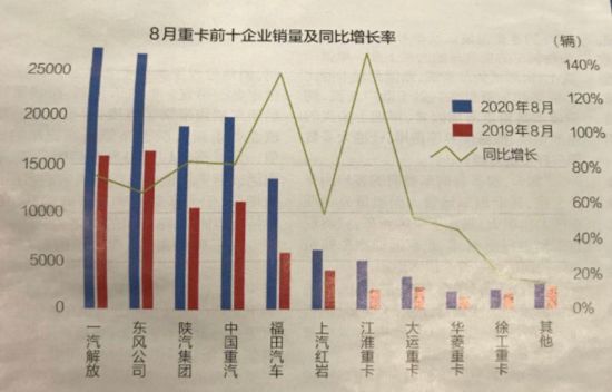 8月,在重卡市場(chǎng)高速增長的帶動(dòng)下,排名前十的重卡企業(yè)均實(shí)現(xiàn)了同比增長。