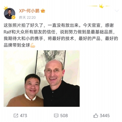 7月26日晚,小鵬汽車(chē)董事長(zhǎng)兼首席執(zhí)行官何小鵬發(fā)布微博放出了他和貝瑞德(Ralf?Brandstaetter)的合影。其在微博稱(chēng):“這張照片拍了好久了,一直沒(méi)有放出來(lái)。今天官宣,感謝Ralf和大眾所有朋友的信任,說(shuō)到努力做到是最基礎(chǔ)品質(zhì),我期待大和小的攜手,將最好的技術(shù)、最好的產(chǎn)品、最好的品牌帶到全球?!?/p>