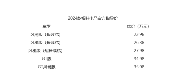 2023年12月10日,2024款福特電馬車型正式上市,新車按照動(dòng)力和純電續(xù)航里程的差異,共推出了5款車型,售價(jià)區(qū)間為23.98萬(wàn)-35.98萬(wàn)元。作為改款車型,新車主要針對(duì)電池系統(tǒng)和車機(jī)系統(tǒng)做出優(yōu)化升級(jí)。
