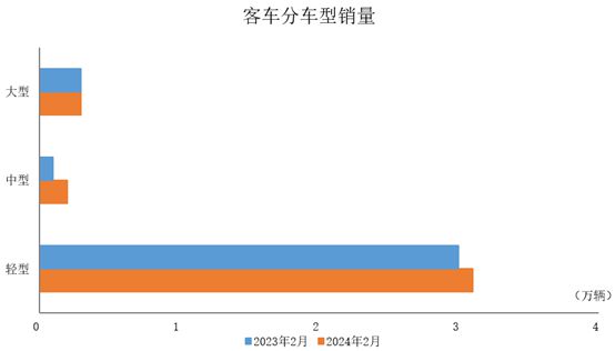 2024年2月,客車產(chǎn)銷分別完成3萬輛和3.6萬輛,產(chǎn)量環(huán)比下降15.7%,銷量環(huán)比增長1.6%;產(chǎn)量同比下降13%,銷量同比增長6.9%。與上月相比,輕型客車產(chǎn)量呈兩位數(shù)下降、銷量小幅增長,其他兩大類客車品種產(chǎn)銷均呈兩位數(shù)下降;與上年同期相比,大型客車和中型客車產(chǎn)銷均呈明顯增長,輕型客車產(chǎn)量呈兩位數(shù)下降、銷量小幅增長。