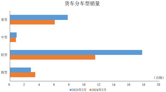 2024年2月,貨車產(chǎn)銷分別完成20.3萬輛和21.5萬輛,環(huán)比分別下降30.4%和25.5%;同比分別下降28.2%和25.9%。與上月相比,微型貨車產(chǎn)量呈兩位數(shù)下降、銷量明顯增長,其他三大類貨車品種產(chǎn)銷均呈兩位數(shù)下降;與上年同期相比,中型貨車產(chǎn)量呈兩位數(shù)增長、銷量呈兩位數(shù)下降,微型貨車產(chǎn)量呈兩位數(shù)下降、銷量呈兩位數(shù)增長,重型貨車和輕型貨車產(chǎn)銷均呈明顯下降。