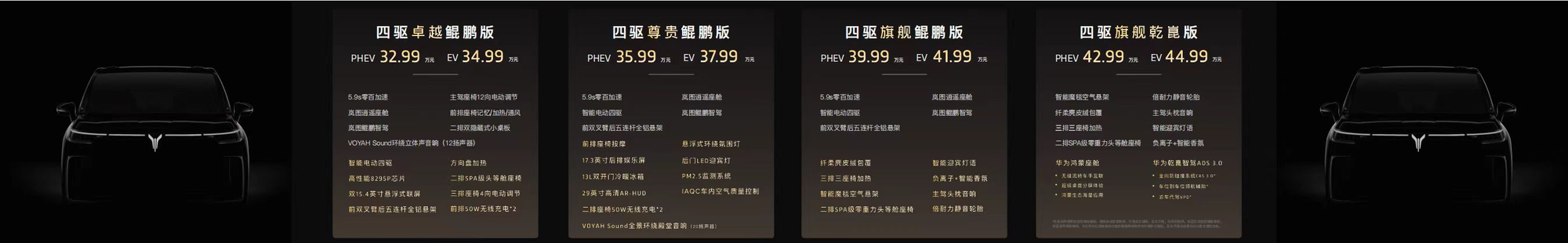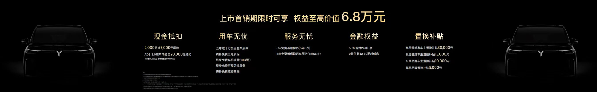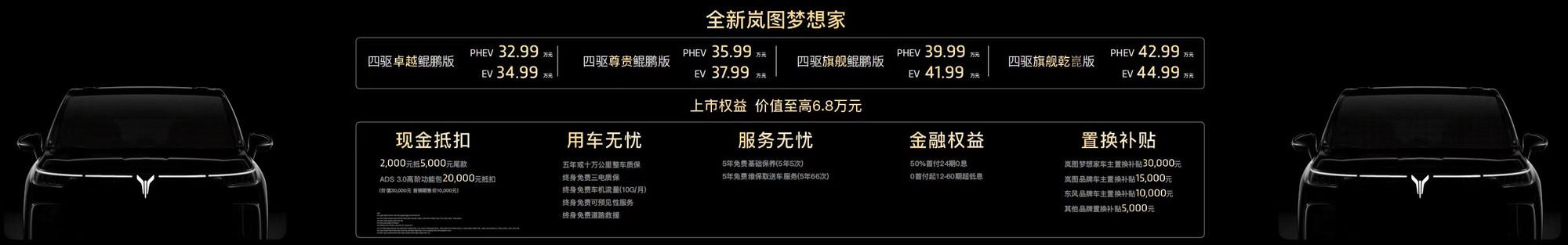 央廣網(wǎng)北京9月20日消息(記者 姜鵬)9月19日,以“感恩相伴 夢(mèng)想同行”為主題的東風(fēng)汽車(chē)感恩6000萬(wàn)用戶相伴暨全新嵐圖夢(mèng)想家上市發(fā)布會(huì)于武漢成功舉辦,全新嵐圖夢(mèng)想家正式上市并公布價(jià)格,其中,全新嵐圖夢(mèng)想家四驅(qū)卓越鯤鵬版PHEV 32.99萬(wàn)元、EV 34.99萬(wàn)元;全新嵐圖夢(mèng)想家四驅(qū)尊貴鯤鵬版PHEV 35.99萬(wàn)元、EV 37.99萬(wàn)元;全新嵐圖夢(mèng)想家四驅(qū)旗艦鯤鵬版PHEV 39.99萬(wàn)元、EV 41.99萬(wàn)元;全新嵐圖夢(mèng)想家四驅(qū)旗艦乾崑版PHEV 42.99萬(wàn)元、EV 44.99萬(wàn)元。同時(shí),截至10月10日,嵐圖還為用戶提供至高6.8萬(wàn)元的首銷期專享權(quán)益,包含2千元抵5千元現(xiàn)金抵扣,原價(jià)3萬(wàn)首銷期僅需1萬(wàn)元的ADS3.0高階智駕包;此外還有用車(chē)無(wú)憂、服務(wù)無(wú)憂、0息金融等權(quán)益;針對(duì)換購(gòu)的用戶還有至高3萬(wàn)元的置換補(bǔ)貼。