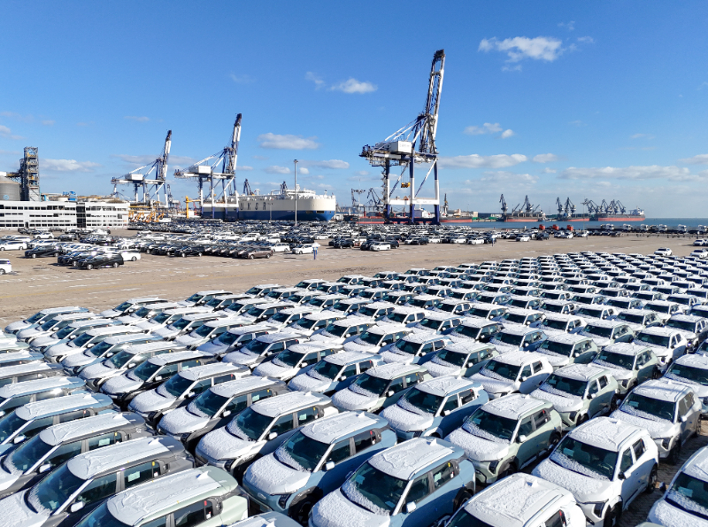 12月8日,大批商品車在山東港口煙臺港等待裝船(無人機照片)。新華社發(fā)(張進剛攝)