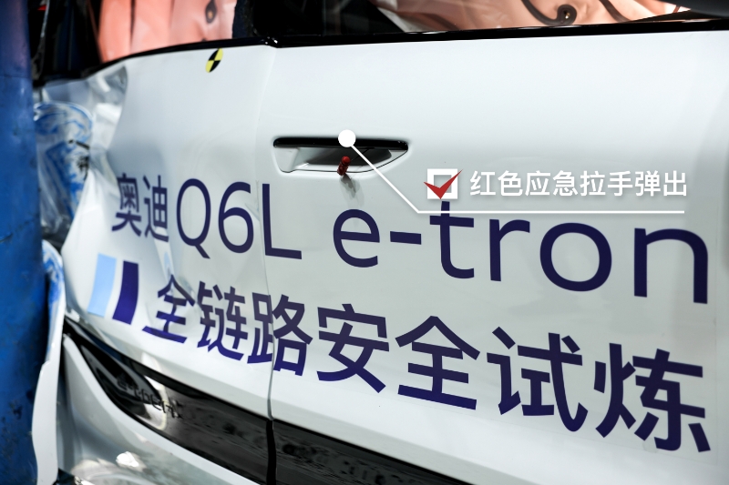 結(jié)果顯示,一汽奧迪Q6L e-tron車身結(jié)構(gòu)完整,A、B、C、D柱均未發(fā)生結(jié)構(gòu)性失效,兩次擠壓下乘員艙依然保持足夠的生存空間。安全帶正常預(yù)緊點(diǎn)爆,側(cè)氣囊、側(cè)氣簾及中央氣囊正常展開,全車假人傷害值均處于優(yōu)秀水平。電池組在遭遇“夾心式?jīng)_擊”后幾乎無變形、無位移,經(jīng)受住幾何形變與短路風(fēng)險雙重考驗(yàn),未發(fā)生冒煙、起火、爆炸或電解液泄漏。高壓系統(tǒng)在毫秒級內(nèi)完成高壓斷電,有效避免短路造成熱失控風(fēng)險。通過科學(xué)的走線,有效的結(jié)構(gòu)保護(hù),以及冗余的功能設(shè)計,保障極限場景下低壓電正常工作。半隱藏式車門把手的紅色應(yīng)急拉手正常彈出,前排車門可正常打開,電動座椅可調(diào)節(jié);車窗自動下降,保障車內(nèi)空氣流動。碰撞后雙閃及時開啟,E-CALL及時啟動并接通人工客服。從堅若磐石的乘員艙結(jié)構(gòu),到周全可靠的碰撞后救援機(jī)制等,每一個安全細(xì)節(jié)都交出了高分答卷。