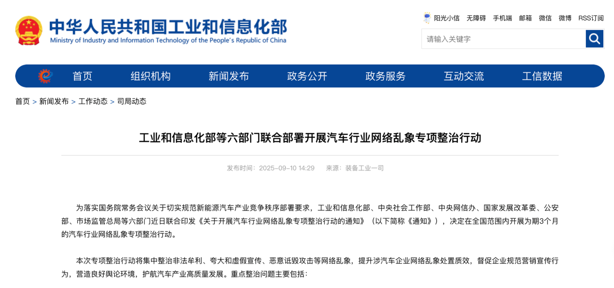 央廣網(wǎng)北京9月10日消息(記者董楠)9月10日,工業(yè)和信息化部(以下簡(jiǎn)稱“工信部”)、中央社會(huì)工作部、中央網(wǎng)信辦、國家發(fā)展改革委、公安部、市場(chǎng)監(jiān)管總局等六部門聯(lián)合印發(fā)《關(guān)于開展汽車行業(yè)網(wǎng)絡(luò)亂象專項(xiàng)整治行動(dòng)的通知》,決定在全國范圍內(nèi)開展為期3個(gè)月的汽車行業(yè)網(wǎng)絡(luò)亂象專項(xiàng)整治行動(dòng)。