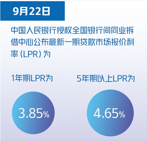 9月22日,中國(guó)人民銀行授權(quán)全國(guó)銀行間同業(yè)拆借中心公布最新一期貸款市場(chǎng)報(bào)價(jià)利率(LPR)為:1年期LPR為3.85%,5年期以上LPR為4.65%。兩項(xiàng)貸款市場(chǎng)報(bào)價(jià)利率均連續(xù)18個(gè)月保持這一水平。