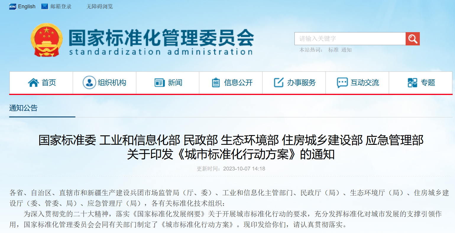 央廣網(wǎng)北京10月8日消息 據(jù)國家標(biāo)準(zhǔn)化管理委員會(huì)網(wǎng)站消息,為落實(shí)《國家標(biāo)準(zhǔn)化發(fā)展綱要》關(guān)于開展城市標(biāo)準(zhǔn)化行動(dòng)的要求,充分發(fā)揮標(biāo)準(zhǔn)化對(duì)城市發(fā)展的支撐引領(lǐng)作用,近日,國家標(biāo)準(zhǔn)化管理委員會(huì)會(huì)同工業(yè)和信息化部、民政部、生態(tài)環(huán)境部、住房城鄉(xiāng)建設(shè)部、應(yīng)急管理部制定了《城市標(biāo)準(zhǔn)化行動(dòng)方案》(以下簡稱《行動(dòng)方案》)。