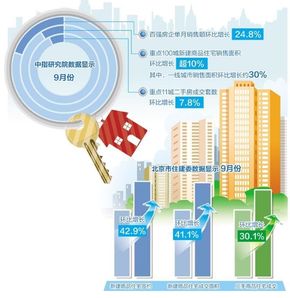 隨著需求釋放動(dòng)能減弱,9月后兩周成交量明顯下降。北京市住建委數(shù)據(jù)顯示,9月份,北京新建商品住宅簽約5891套,成交面積67.96萬(wàn)平方米,環(huán)比分別增長(zhǎng)42.9%和41.1%;二手商品住宅成交14262套,環(huán)比增長(zhǎng)30.1%。