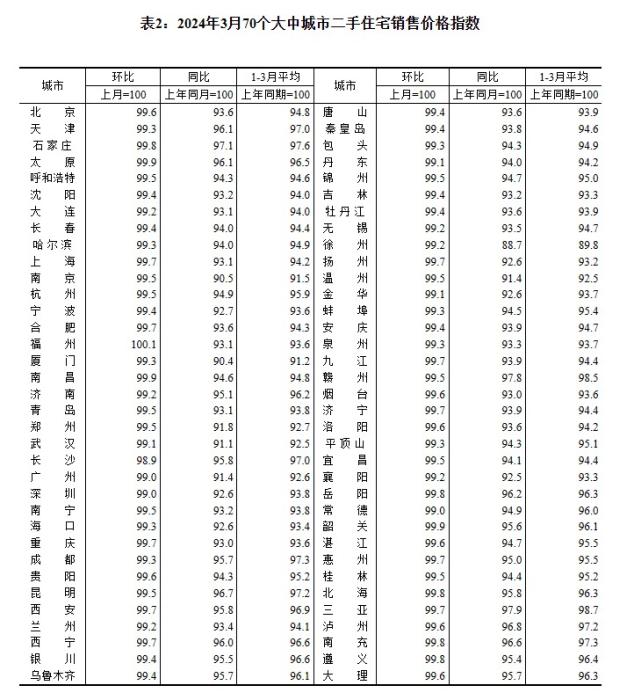 2024年3月70個大中城市二手住宅銷售價格指數(shù)。 截圖自國家統(tǒng)計局官網(wǎng)