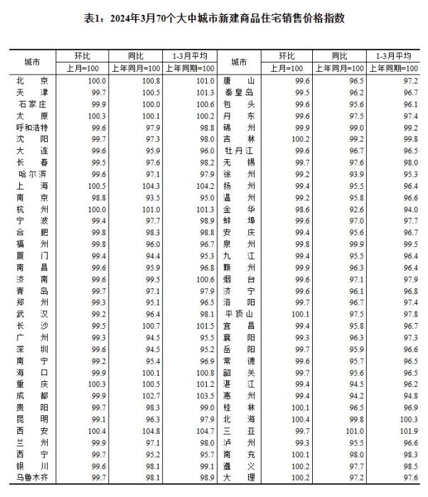 2024年3月70個大中城市新建商品住宅銷售價格指數(shù)。 截圖自國家統(tǒng)計局官網(wǎng)