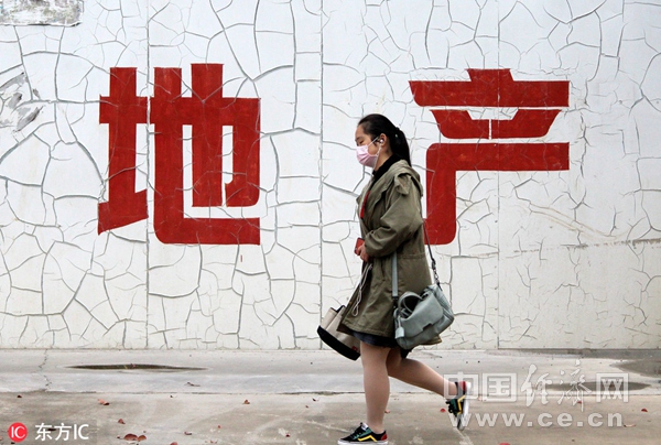 圖片說明:2018年10月16日,江蘇常州,市民從布滿裂縫的地產(chǎn)公司圍擋邊經(jīng)過。(圖片來源:東方IC)