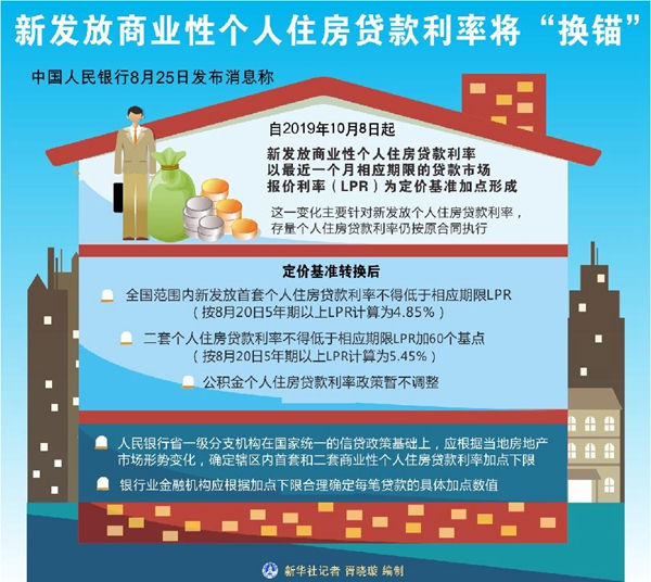 新華社北京8月25日電(記者張千千)中國人民銀行25日發(fā)布消息稱,自今年10月8日起,新發(fā)放商業(yè)性個人住房貸款利率以最近一個月相應(yīng)期限的貸款市場報價利率(LPR)為定價基準(zhǔn)加點(diǎn)形成。這一變化主要針對新發(fā)放個人住房貸款利率,存量個人住房貸款利率仍按原合同執(zhí)行。