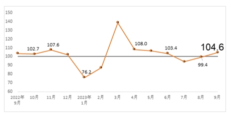 據(jù)中國建筑材料聯(lián)合會(huì)發(fā)布的數(shù)據(jù)顯示,2023年9月份建筑材料工業(yè)景氣指數(shù)為104.6點(diǎn),較上月回升5.2點(diǎn),高于臨界點(diǎn),處于景氣區(qū)間,建筑材料工業(yè)運(yùn)行有所恢復(fù)。