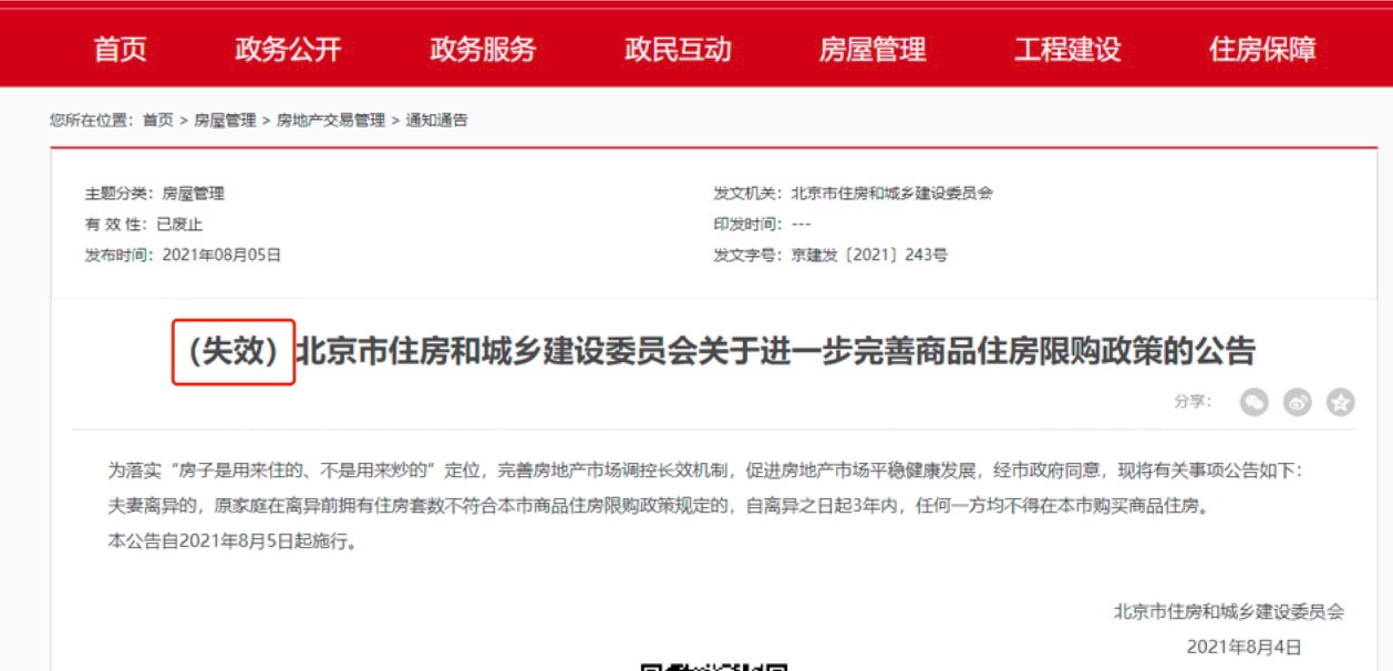2021年8月4日,北京市住建委發(fā)文規(guī)定,夫妻離異的,原家庭在離異前擁有住房套數(shù)不符合本市商品住房限購(gòu)政策規(guī)定的,自離異之日起3年內(nèi),任何一方均不得在本市購(gòu)買商品住房。