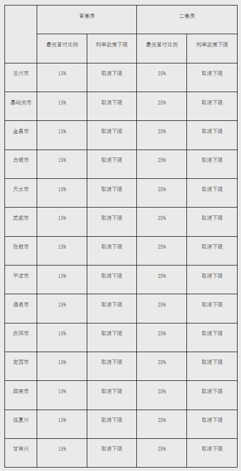 貸款利率政策下限方面:(一)蘭州、白銀、平?jīng)?市,在前期已取消首套住房商業(yè)性個人住房貸款利率政策下限的基礎(chǔ)上,取消二套住房商業(yè)性個人住房貸款利率政策下限。(二)嘉峪關(guān)、金昌、天水、武威、張掖、酒泉、慶陽、定西、隴南、臨夏、甘南等11個市州,取消首套和二套住房商業(yè)性個人住房貸款利率政策下限。在本政策范圍內(nèi),各行可結(jié)合本機構(gòu)經(jīng)營狀況、客戶風(fēng)險等因素,合理確定每筆貸款的具體利率水平。