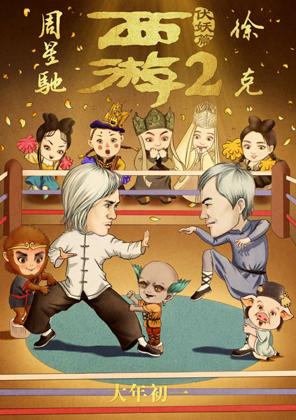 此外,隨預(yù)告片一同發(fā)布的“對(duì)壘版”漫畫(huà)海報(bào)也非常逗趣:周星馳與徐克兩人化身武林高手的漫畫(huà)形象在擂臺(tái)上展開(kāi)對(duì)壘。周星馳太極拳的姿勢(shì)與影片《功夫》中阿星的形象極為相似,徐克的招式動(dòng)作也很有黃飛鴻的架勢(shì)。而化身為Q版造型的師徒四人則為擂臺(tái)上的兩人按摩捶腿、加油助威,充滿童趣。