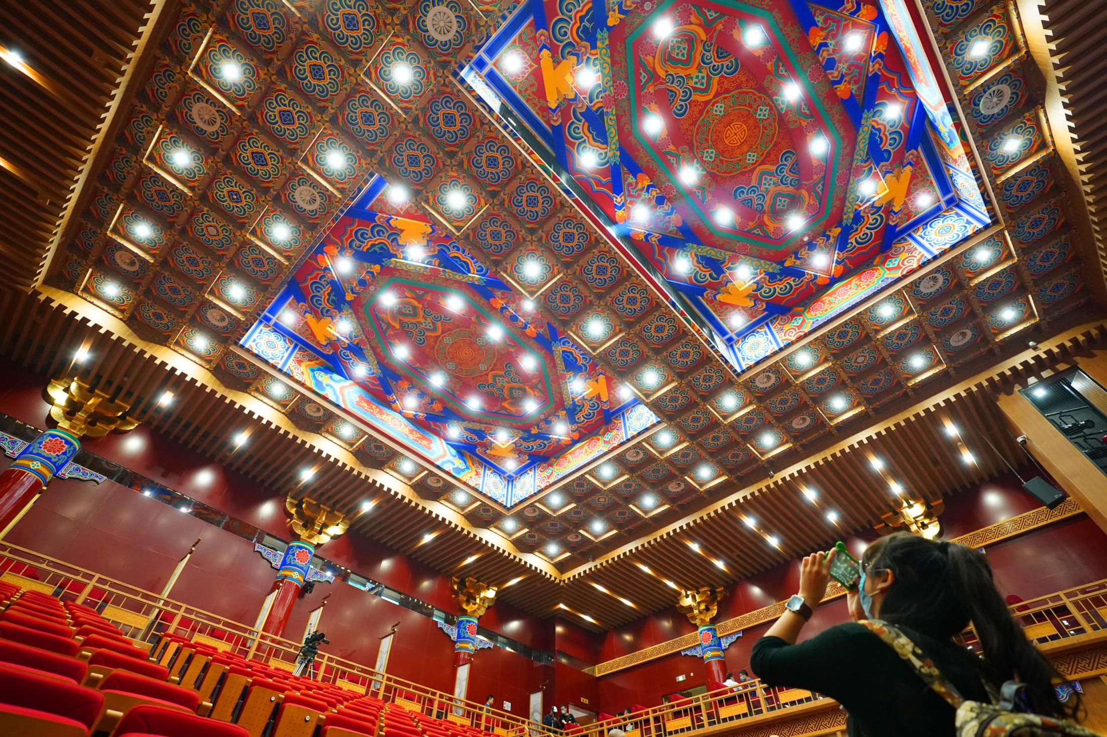 2021年7月9日,時(shí)隔28年,由北京市文化和旅游局、北京市國有資產(chǎn)經(jīng)營(yíng)有限責(zé)任公司共同出資,北京京劇院、北京市演出有限責(zé)任公司共同運(yùn)營(yíng)的吉祥大戲院重張啟幕。這座“藏身”于銀泰in88大廈7層、8層的空中戲院占地面積達(dá)4000平方米。乘電梯上樓,初入眼簾的前廳清新雅致,落地窗外可見王府井熙攘的人群與遠(yuǎn)處故宮、景山等古都風(fēng)光;劇場(chǎng)內(nèi),明清風(fēng)格古樸莊重,藻井彩繪繁復(fù)斑斕,傳統(tǒng)的“旋子彩繪”上增加了大量寓意吉祥的“萬字不到頭”圖案,與戲院的名字彼此呼應(yīng)。