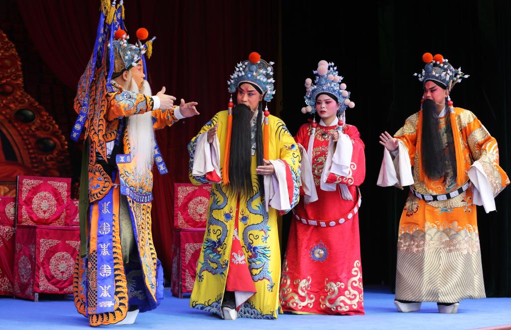 中國戲劇梅花獎(jiǎng)得主、來自寧夏秦腔劇院的國家一級演員李小雄(左一)在甘肅省定西市體育公園演唱秦腔經(jīng)典傳統(tǒng)劇《金沙灘》(9月21日攝)。新華社發(fā)(王克賢攝)