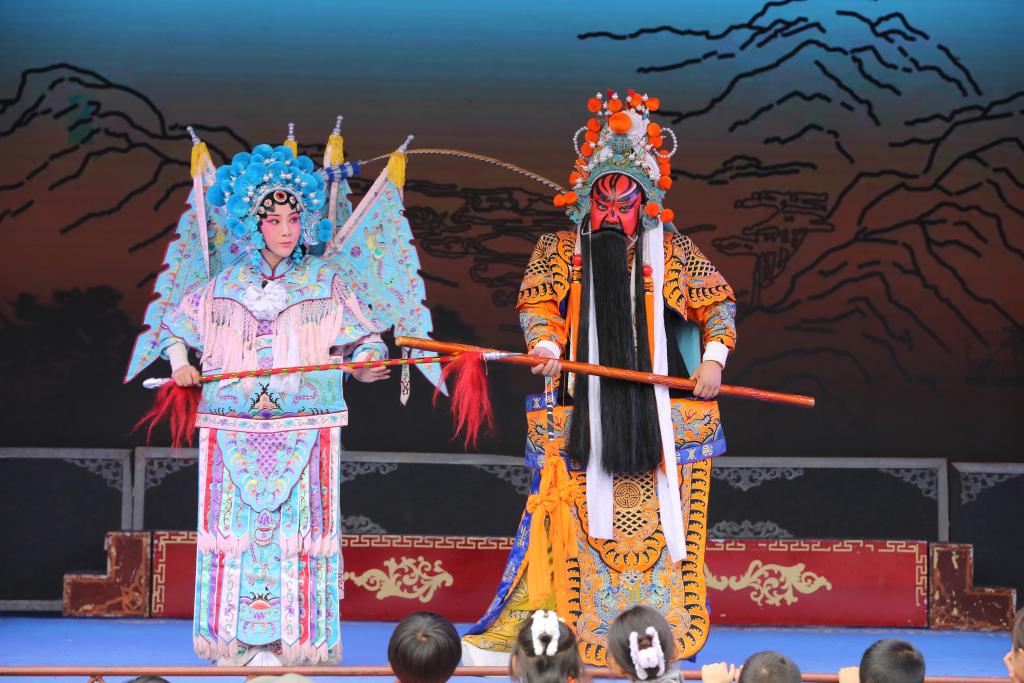 中國戲劇梅花獎(jiǎng)得主、來自寧夏秦腔劇院的國家一級演員韋小兵(右)在甘肅省定西市體育公園演唱秦腔經(jīng)典傳統(tǒng)劇《下河?xùn)|》(9月23日攝)。新華社發(fā)(王克賢攝)