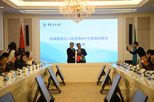 (左:中國傳媒大學(xué)校長張樹庭右:鐵穆爾別克·朱爾根諾夫哈薩克國立藝術(shù)學(xué)院院長欽格斯·葉爾果別克)