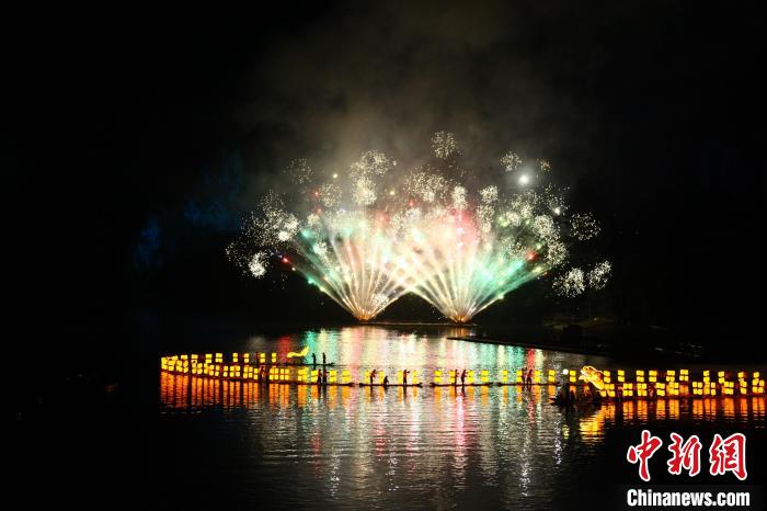 慶典演出現(xiàn)場人頭攢動,開場無人機表演在半空組合出紀(jì)念“印象劉三姐20年”的圖案,舞臺上擊鼓而舞的表演者渲染歡樂氛圍。以絢爛煙火為背景,漁翁表演者在江面組成蜿蜒長龍,引得游客們紛紛贊嘆拍照。慶典演出環(huán)節(jié),桂林旅游學(xué)院和《印象·劉三姐》的演員們共同表演的舞蹈《漓江·春茶》、百人合唱《侗族大歌》、實景展演《龍騰印象》等精彩節(jié)目,帶來一場視覺盛宴。