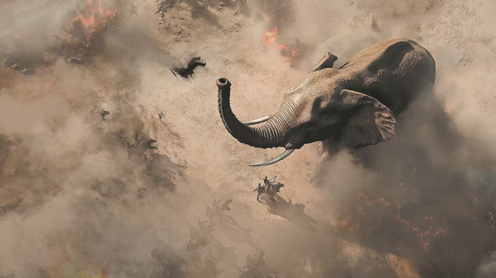 百米青銅巨門徐徐開啟,祭祀臺(tái)上女子隨樂獨(dú)舞,突然黃沙漫天,戰(zhàn)象狂奔而來(lái),未等塵埃落定,視線閃回“博物館”,金戈鐵馬化作一尊尊精美文物浮現(xiàn)眼前……