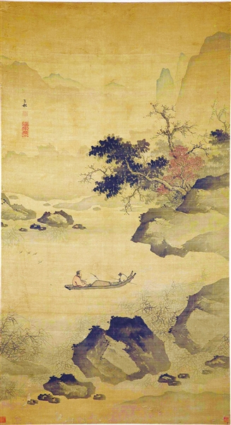 天博館藏明代蔣嵩的《秋江歸棹圖》軸,畫中遠(yuǎn)山如黛,江面微微泛波,一葉小舟悠然浮在水面。船夫回頭張望,船尾一老者閑適地看書,任憑小舟在水中飄蕩。岸上有山石樹木,水邊有蘆葦叢叢,一派秋季的醉人風(fēng)光。天博書畫研究部的李晶介紹:“畫面層次感很強(qiáng),布局優(yōu)美,遠(yuǎn)山近水、山石、樹木、蘆葦搭配得相得益彰。內(nèi)容豐富,意境簡(jiǎn)淡,水墨厚重。山石兼皴帶染,筆墨滋潤(rùn)?!?/p>