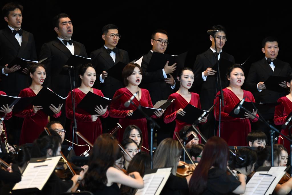9月10日晚,西安交響樂(lè)團(tuán)合唱團(tuán)在西安大雁塔北廣場(chǎng)戶外公演。新華社記者 李一博 攝