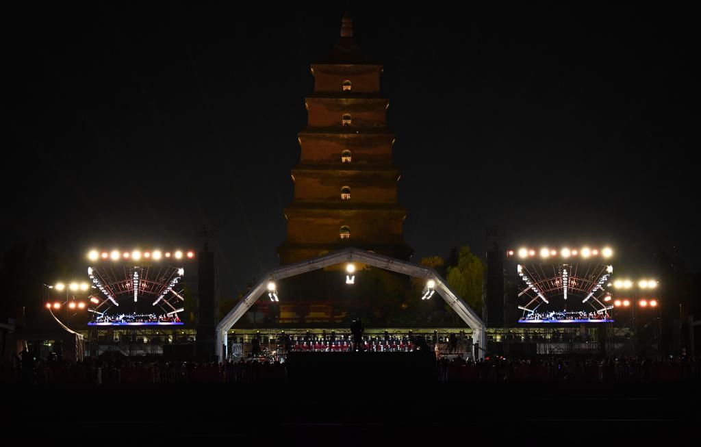 9月10日晚,西安交響樂(lè)團(tuán)在西安大雁塔北廣場(chǎng)戶外公演。新華社記者 李一博 攝
