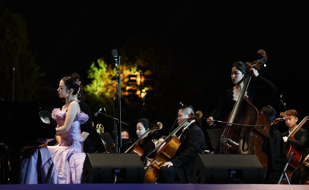 9月10日晚,鋼琴家吉娜·愛(ài)麗絲(前左)與西安交響樂(lè)團(tuán)在西安大雁塔北廣場(chǎng)戶外公演。新華社記者 李一博 攝