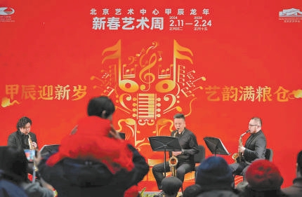 北京藝術(shù)中心也是張燈結(jié)彩,集合音符、北京藝術(shù)中心外觀、龍年等元素的“春”字海報(bào)處處皆是,靈活多變的室內(nèi)樂重奏飄揚(yáng)在公共區(qū)域中,撒下一顆顆藝術(shù)普及的種子。