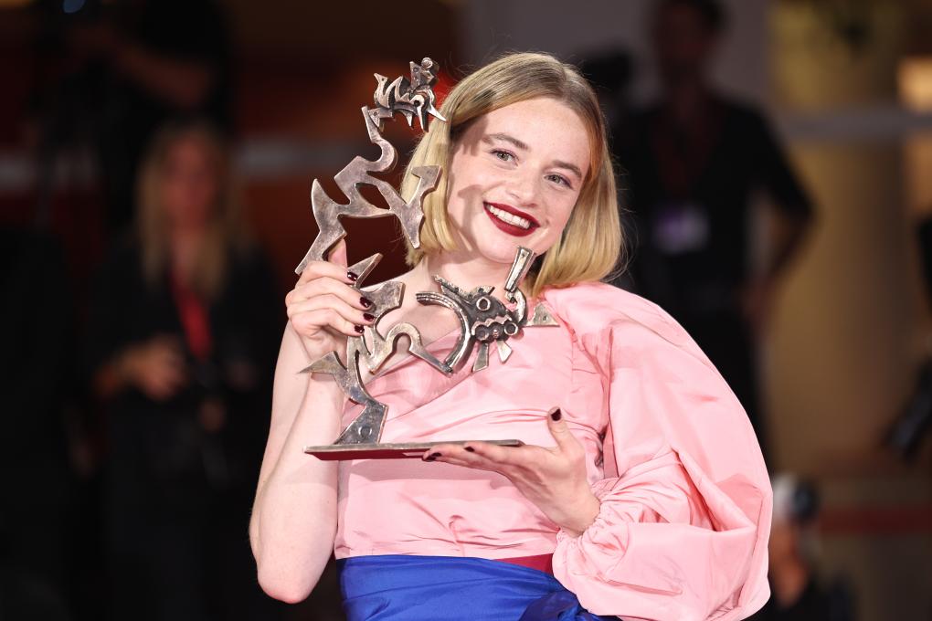9月6日,在意大利威尼斯,最佳新演員獎獲得者、電影《寂靜的朋友》演員盧娜·韋德勒與獎杯合影。新華社記者 李京 攝