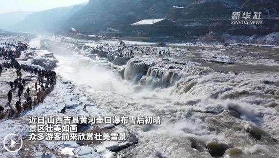 近日,山西吉縣黃河壺口瀑布雪后初晴,景區(qū)壯美如畫,眾多游客前來欣賞壯美雪景。從空中俯瞰,瀑布仿佛披上了一層潔白的輕紗,黃河水夾雜著流凌從上游呼嘯而下,跌入十里龍槽,激起陣陣白色水霧,經陽光折射后,一道美麗的彩虹若隱若現(xiàn),美不勝收。
