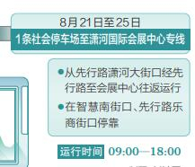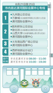 太原市將在山西文博會(huì)期間開(kāi)通5條免費(fèi)公交接駁專(zhuān)線。其中,4條市內(nèi)直達(dá)瀟河國(guó)際會(huì)展中心的專(zhuān)線,分別從九豐路公交總站—萬(wàn)象城(北向南新晉祠路長(zhǎng)興北街口公交站)—瀟河國(guó)際會(huì)展中心;勝利橋東公交總站—敦化坊(北向南建設(shè)北路敦化坊公交站)—山西大學(xué)(北向南塢城路山西大學(xué)公交站)—瀟河國(guó)際會(huì)展中心;火車(chē)南站西廣場(chǎng)公交站—瀟河國(guó)際會(huì)展中心;西橋地鐵站B站口—瀟河國(guó)際會(huì)展中心。運(yùn)行時(shí)間為市內(nèi)至瀟河方向8:00—15:00,瀟河至市內(nèi)方向10:00—18:00。此外,為便于駕車(chē)自行前往的市民出行,還開(kāi)通了1條社會(huì)停車(chē)場(chǎng)至山西瀟河國(guó)際會(huì)展中心的免費(fèi)接駁線路。該線路從先行路瀟河大街口經(jīng)先行路至?xí)怪行耐颠\(yùn)行,在智慧南街口、先行路樂(lè)商街口???,運(yùn)行時(shí)間為9:00—18:00。
