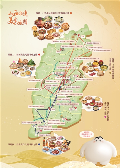 這5條非遺美食線路以“晉商文化”“面食王國”“藥膳康養(yǎng)”等為主題,以3日游或4日游為主,包括晉北民族融合文化探源之旅、晉西黃土風(fēng)情尋味之旅、晉中醋香面韻美食雙絕之旅、晉南麥作文明尋根之旅、晉東南藥膳山珍秘境之旅,覆蓋醋釀、面藝等30余項省級以上非遺美食項目,串聯(lián)起太原、大同、長治等全省11市30多個非遺工坊以及眾多歷史街區(qū)、自然景觀,形成“美食+非遺+景區(qū)”的立體化文旅線路。