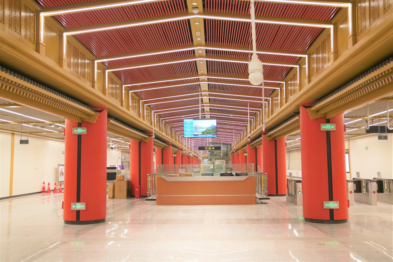 長風(fēng)街站則以《西廂記》為靈感,提取中式園林月亮門元素,既展現(xiàn)出劇里的浪漫,又裹著中式園林的柔,營造出“比翼雙飛”的浪漫氛圍。
