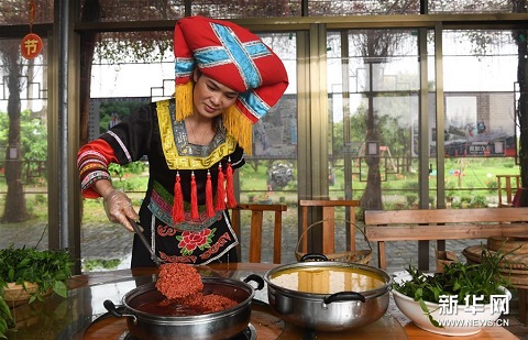 上五圖:4種不同植物及其色素染成的糯米和原色糯米;下左圖:4種不同植物色素染成的糯米和原色糯米;下右圖:在廣西上林縣巷賢鎮(zhèn),兩名壯族村民在查看一桶剛剛蒸熟的五色糯米飯(拼版圖片,3月25日攝)。 每年“壯族三月三”到來(lái)之際,廣西的壯族同胞都有蒸制五色糯米飯迎接節(jié)日的習(xí)俗,以祈禱五谷豐登,五福臨門。這些五色糯米飯,主要采用天然植物萃取色素,將糯米分別浸泡到紫、黃、紅、黑4種不同植物色素的水里,充分染色后,與原色糯米一起蒸熟而成。色澤鮮艷、清香誘人的五色糯米飯,是“壯族三月三”接待來(lái)客時(shí)必不可少的傳統(tǒng)美食。新華社記者 陸波岸 攝