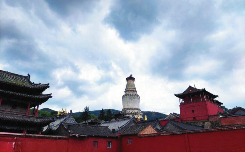 五臺山最具代表性的鈴聲就是從塔院寺高聳入云的大白塔上傳出的風(fēng)鈴聲。大白塔環(huán)周83.8米,通高75.3米,塔高56.4米,比北京北海白塔還高20.5米,比代縣阿育王塔高16.5米,是元大德五年(1301年)由尼泊爾匠師阿尼哥設(shè)計建造的尼泊爾式大塔,也是我國現(xiàn)存元代最高的覆缽式塔建筑。大白塔基座呈東、西、南、北、東南、東北、西南、西北八角形,塔身上面13層,呈由粗及細(xì)的輪狀造型,稱“十三天”,又名“十三相輪”?!笆臁鄙厦嫔w著8塊銅板,按乾、坎、艮、震、巽、離、坤、兌八卦位置安裝,周長23.1米,檐邊吊裝銅質(zhì)垂檐36塊,共安裝風(fēng)鈴108個,連同束腰風(fēng)鈴共252個。塔頂裝有高5.4米的鍍金寶瓶。整座白塔形如藻瓶,上下比例協(xié)調(diào),造型別致典雅。每當(dāng)風(fēng)吹鈴響,風(fēng)鐸鳴四端,悠然成風(fēng)韻,讓人油然而生崇敬之感。