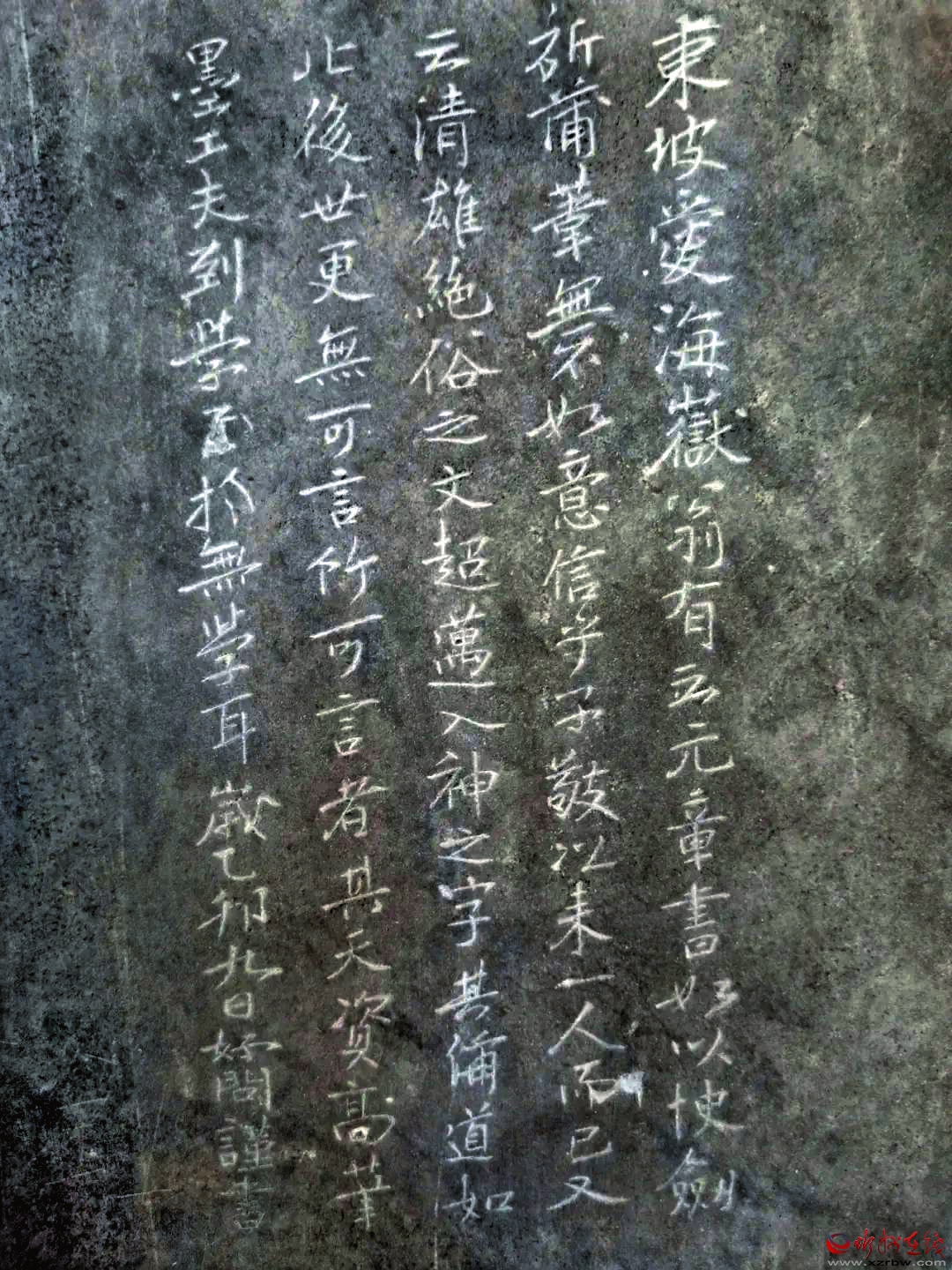 凡拜謁過(guò)野史亭的人,都曾看到過(guò)亭壁上所嵌的遺山先生像和五塊詩(shī)文石刻。石刻均有小字作注,尤其西壁的一塊上竟刻著500余字,因空間狹窄,刻痕甚淺,一些字跡已難辨識(shí)。幸運(yùn)的是該石拓片背面筆痕十分明顯,于是筆者就著燈光將這段文字全部抄錄下來(lái),得以了解亭中每塊石刻的詳細(xì)信息。
