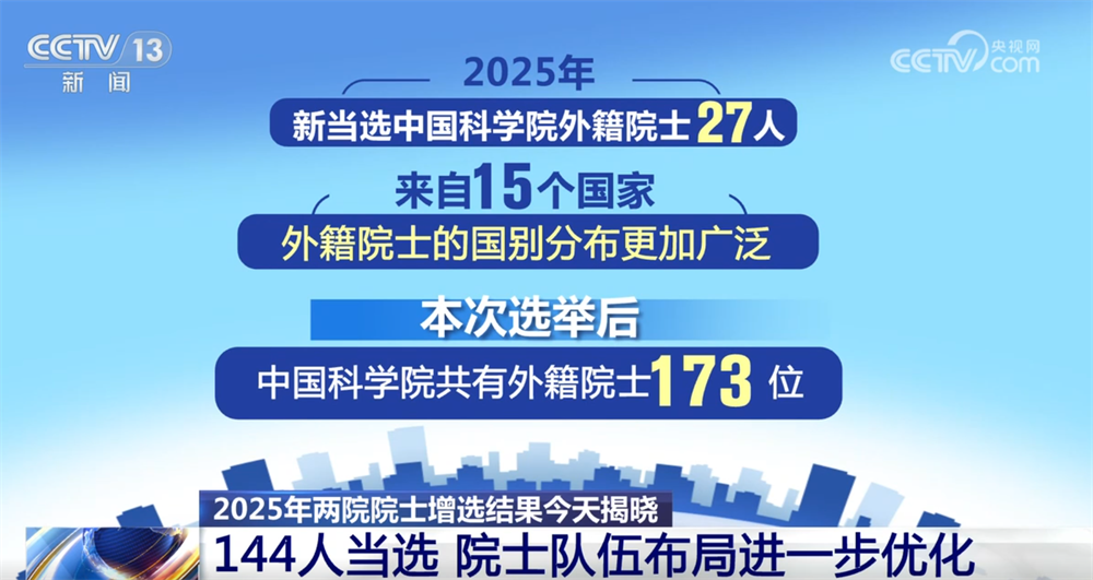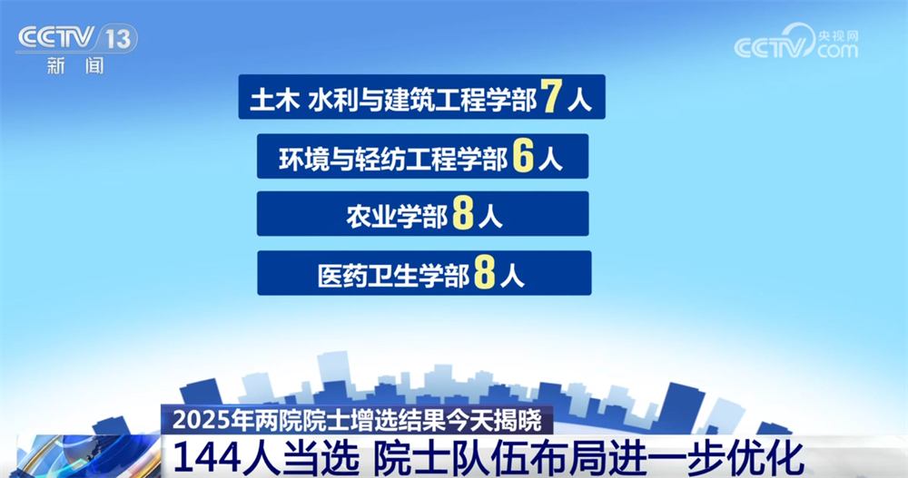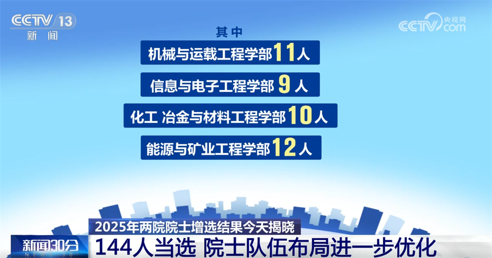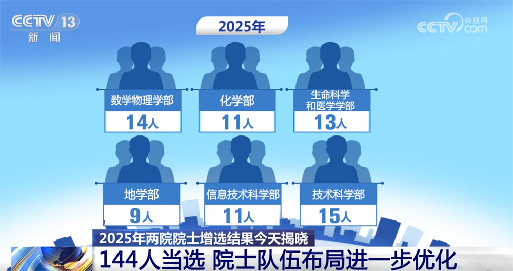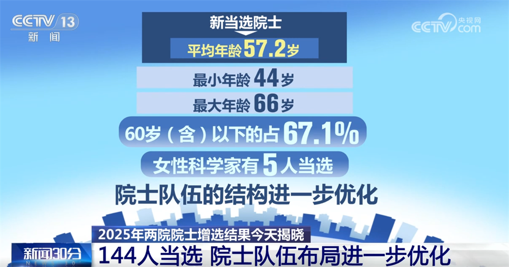 央視網(wǎng)消息:11月21日,2025年兩院院士增選結(jié)果正式揭曉,共有144人當(dāng)選,院士隊(duì)伍的年齡結(jié)構(gòu)、學(xué)科、地區(qū)和行業(yè)布局進(jìn)一步優(yōu)化。