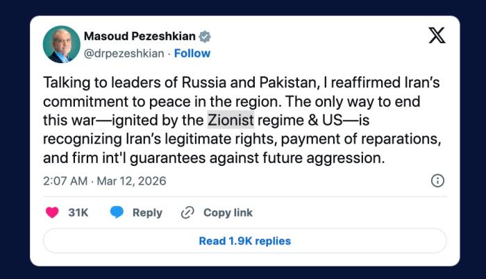 據(jù)報道,佩澤希齊揚表示,結(jié)束當前由美國和以色列挑起的戰(zhàn)爭的“唯一途徑”,是承認伊朗的合法權(quán)利、支付戰(zhàn)爭賠償,并由國際社會提供防止未來侵略行為的堅定保證。